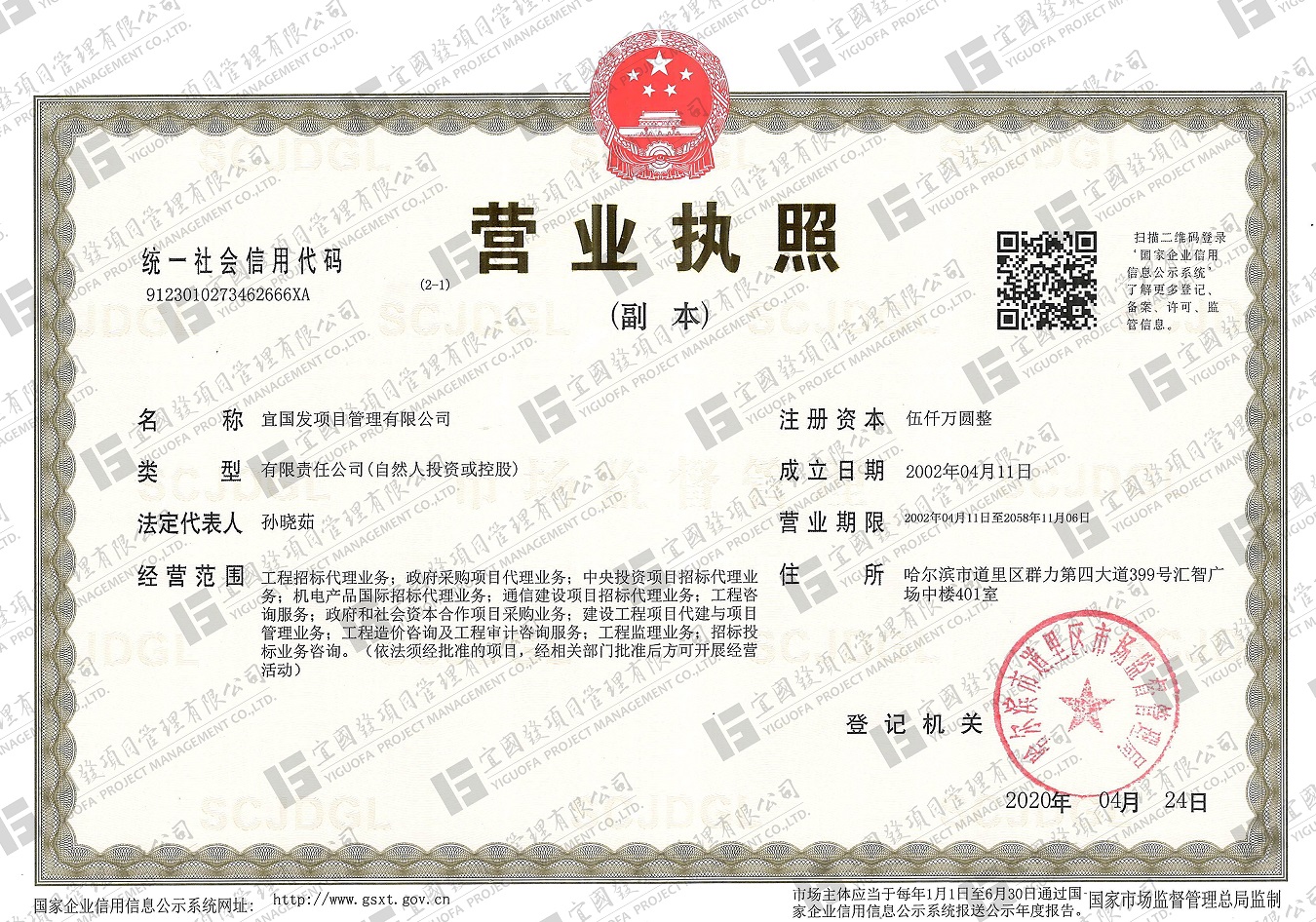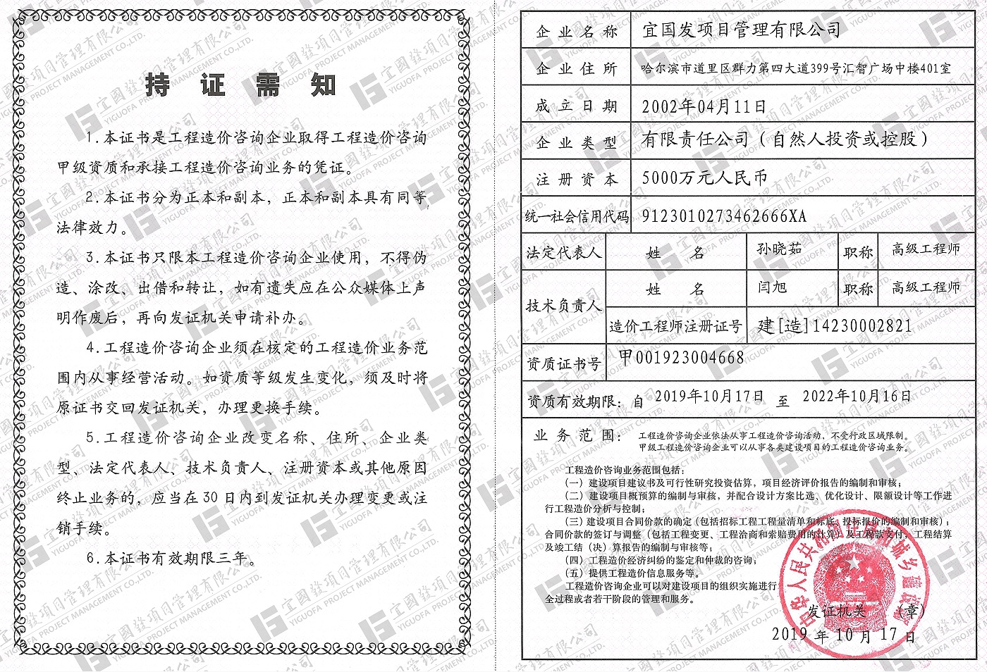 宜國發(fā)項(xiàng)目管理有限公司(原名黑龍江國發(fā)項(xiàng)目管理有限責(zé)任公司)成立于2002年4月,公司注冊(cè)資金5000萬元人民幣,具有獨(dú)立法人資格。現(xiàn)具備國家住房和城鄉(xiāng)建設(shè)部頒發(fā)的工程招標(biāo)代理機(jī)構(gòu)甲級(jí)資質(zhì),發(fā)展和改革委員會(huì)頒發(fā)的中央投資項(xiàng)目招標(biāo)代理機(jī)構(gòu)甲級(jí)資質(zhì)、財(cái)政部頒發(fā)的政府采購代理機(jī)構(gòu)甲級(jí)資質(zhì),黑龍江省住房和城鄉(xiāng)建設(shè)廳頒發(fā)的工程造價(jià)咨詢企業(yè)甲級(jí)資質(zhì),并已納入全國投資項(xiàng)目在線審批監(jiān)管平臺(tái)工程咨詢單位備案名單、“中國政府采購網(wǎng)”政府采購代理機(jī)構(gòu)名單及“中國國際招標(biāo)網(wǎng)”機(jī)電產(chǎn)品國際招標(biāo)代理機(jī)構(gòu)名單,且通過了質(zhì)量管理體系、環(huán)境管理體系、職業(yè)健康安全管理體系認(rèn)證。